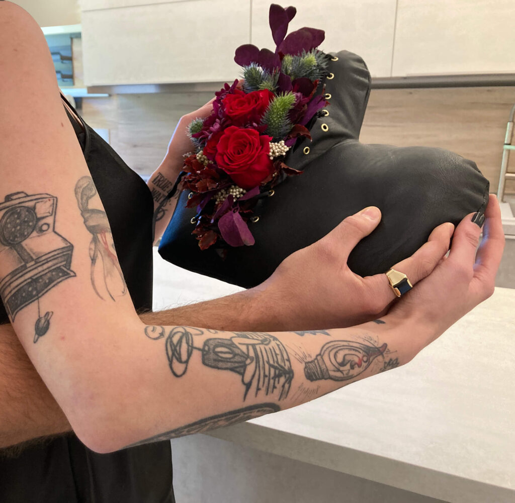 Dalle composizioni floreali più romantiche come l’elegante scatola floreale in velluto, fino al più contemporaneo bouquet a cuore con rasta. C’è spazio per tutti! Per gli amanti dell’artigianalità, con l’atelier E-Mood abbiamo realizzato lavori in tessuto, come il cuore in Jeans, per spiriti moderni, o quelli più rock come i Cuori con spille e borchie.